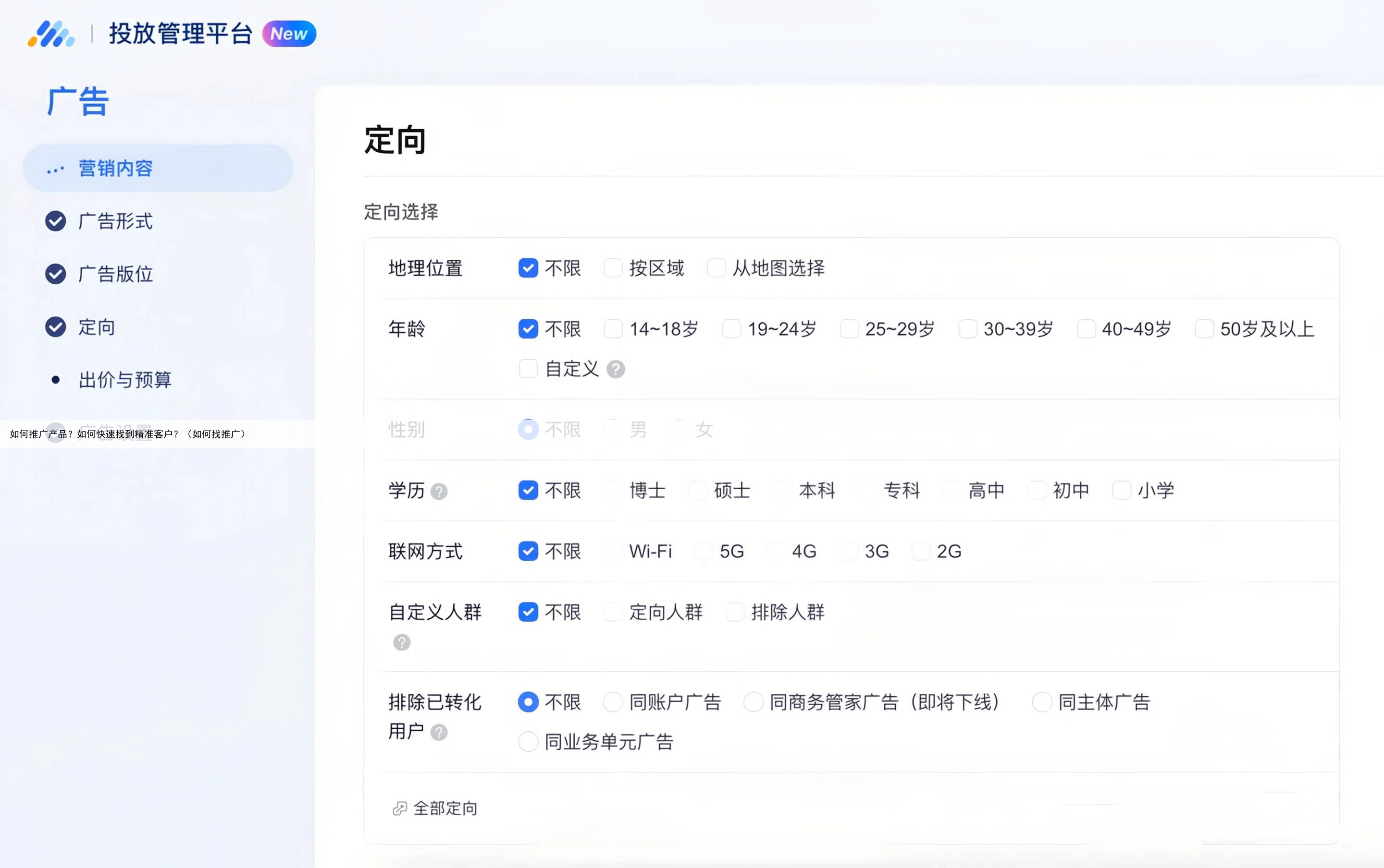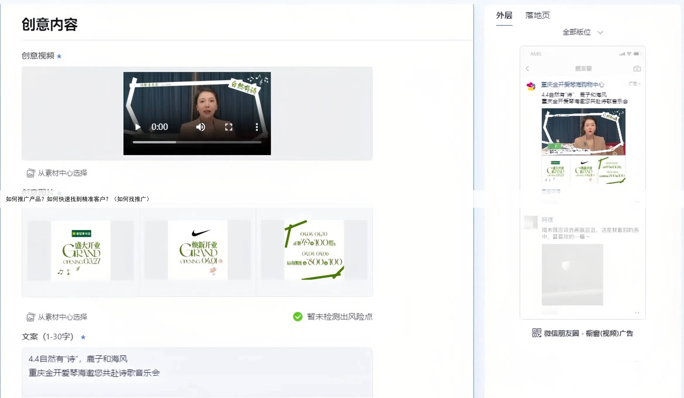 ✅✅全国代投放咨询 +CXGG8013广告创建与设置:明确营销目标(如品牌推广、商品销售、公众号引流),设计外层素材(图片/视频)和内层落地页(H5或小程序链接)设置精准定向参数,包括地域(可精确至商圈)、年龄、性别、兴趣标签(如美食、母婴)及行为数据(如近期搜索关键词)。