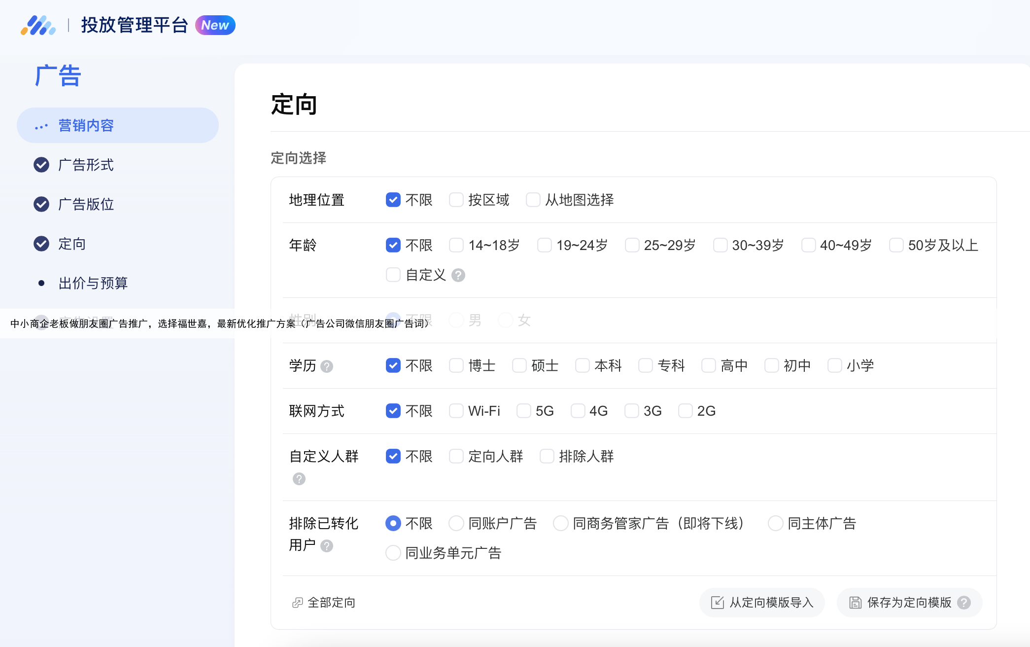 创建计划:明确广告投放的营销目标,选择合适的推广目标和广告位置。设计广告素材:设计广告素材,包括文字、图片、视频等。