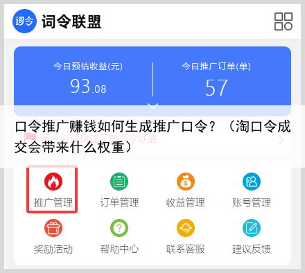 2、登录词令联盟,在推广管理选择“淘宝闪购外卖红包”推广项目。