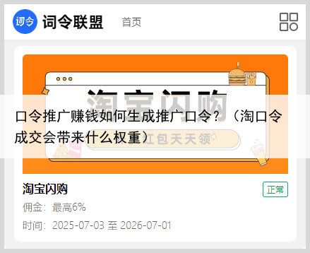 词令联盟已上线众多的口令推广项目,通过词令联盟创建推广口令成交可获得相应的佣金词令联盟如何生成淘宝闪购外卖红包推广口令?1、关注【词令联盟】微信公众服务号或访问词令联盟官网,注册登录成为词令联盟推广者(盟友);。