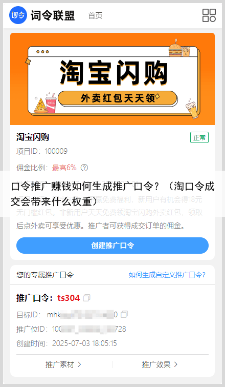 3、进入淘宝闪购外卖红包推广项目,创建推广口令,即可获得词令联盟专属的推广口令。
