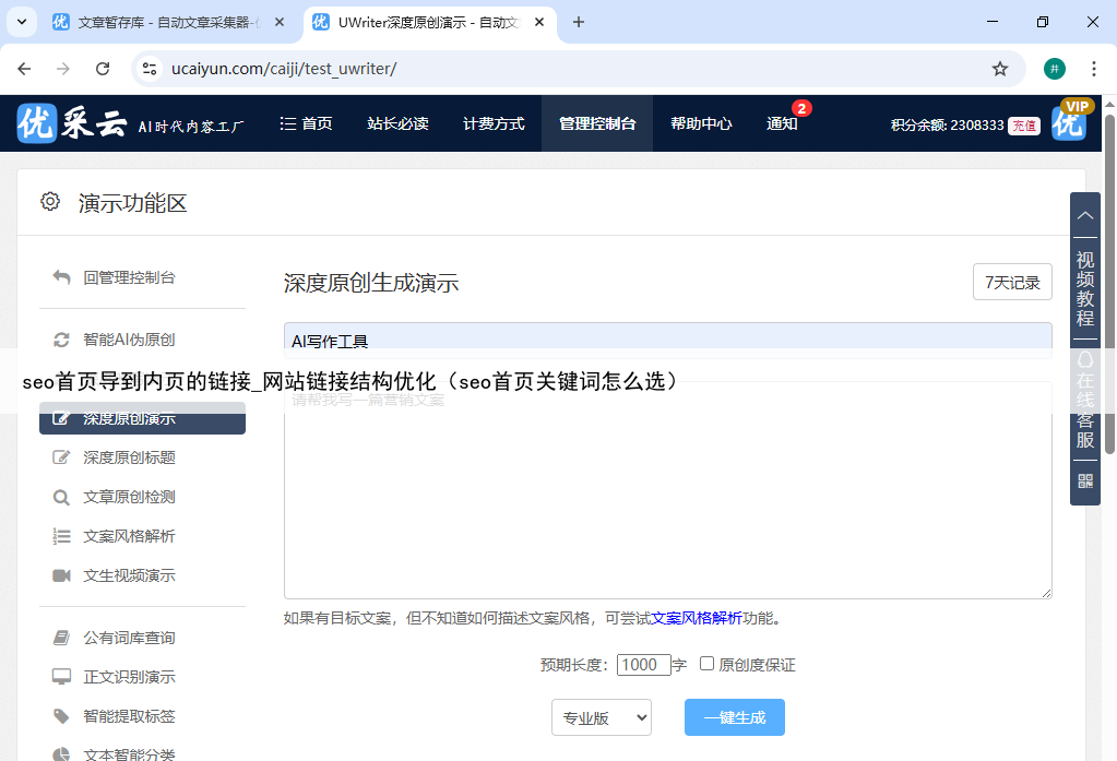 搜索引擎也更青睐这个网站,搜索排名大幅上升接下来,小亮还精心计划使用优采云的深度原创功能来生成更多具备吸引力的内页文章他打算充分利用该功能的优势,挖掘出独特且有价值的内容,以满足用户多样化的需求同时,他还准备搭配自动配图功能,通过智能匹配的方式为生成的文章添加合适的图片,从而让网站内容更加丰富多样,更能吸引用户的目光,提升网站整体的质量和吸引力。