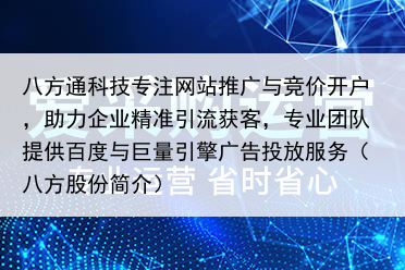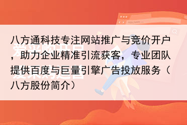 八方通科技专注网站推广与竞价开户,助力企业精准引流获客,专业团队提供百度与巨量引擎广告投放服务(八方股份简介)