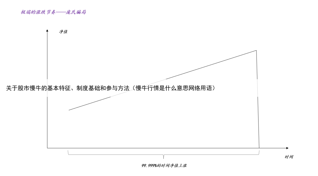 如上图所示,慢牛形态是对旁氏形态的一种修正,红色箭头代表了股市的长期平均回报,黑色的折线代表了股市的实际走势,这种运行节奏同时满足了两个条件:1、上行时间占比高,鼓励投资者长时间持有;2、潜在收益相对合理,不至于让股市涨到天上;