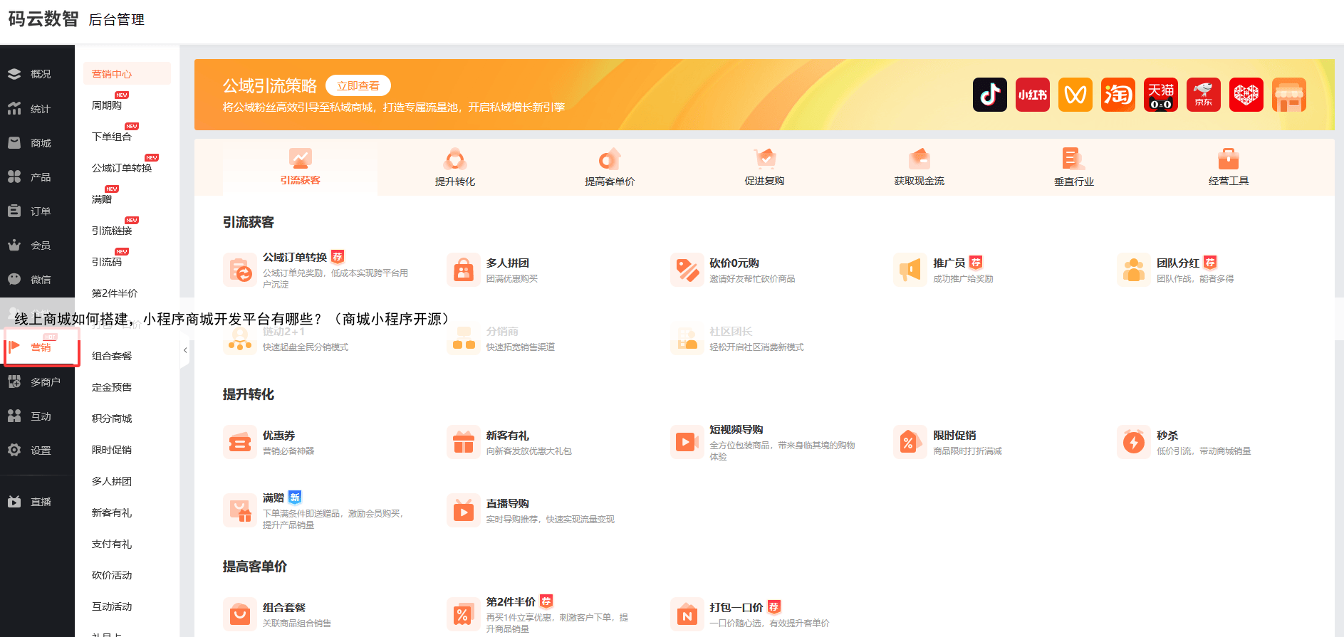 第四步:设置营销功能比如会员储值、积分商城、拼团、秒杀、分销等。