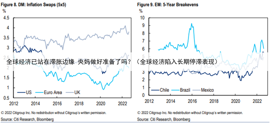 其次,由于目前通胀如此之高,各国央行可以有把握地得出结论,名义中性利率可能高于疫情之前” 另外一种情形是央行的紧缩政策并无法阻止通胀预期飙升,导致经济增速进一步放缓,滞胀风险飙升不过,当前的长期通胀预期仍然“相当”稳定,美国和英国的通胀预期略高于疫情前几年,但对央行而言仍基本上处于较为舒适的境地,欧元区类似。