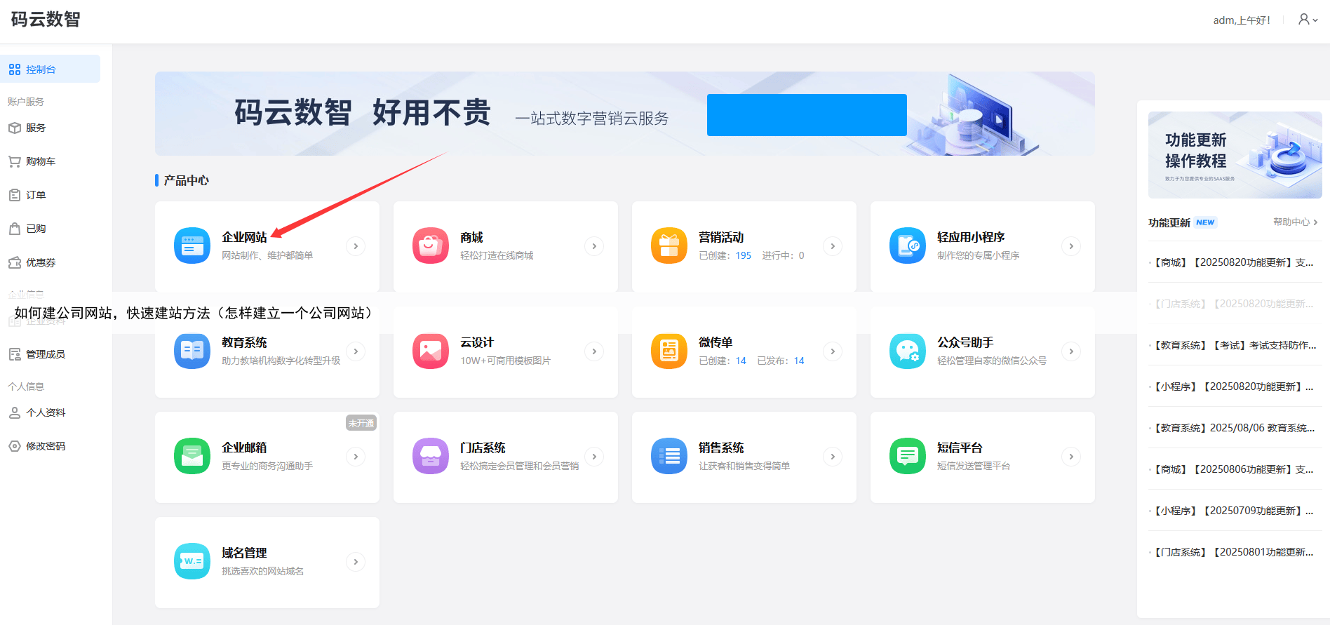 第一步:选择一自助建站平台百度搜索【码云数智】,在【码云数智】自助建站平台注册账号,产品类型选择-企业网站