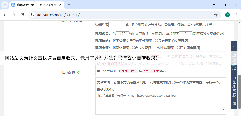 优采云系统还可以对文章进行优化,比如设置标题格式、插入关键词等,进一步提升文章对搜索引擎的友好度一段时间后,他惊喜地发现,使用优采云加上自己的优化方法,网站文章被百度收录的速度明显加快那些关于降温的文章不仅快速被收录,还为网站带来了不少流量。