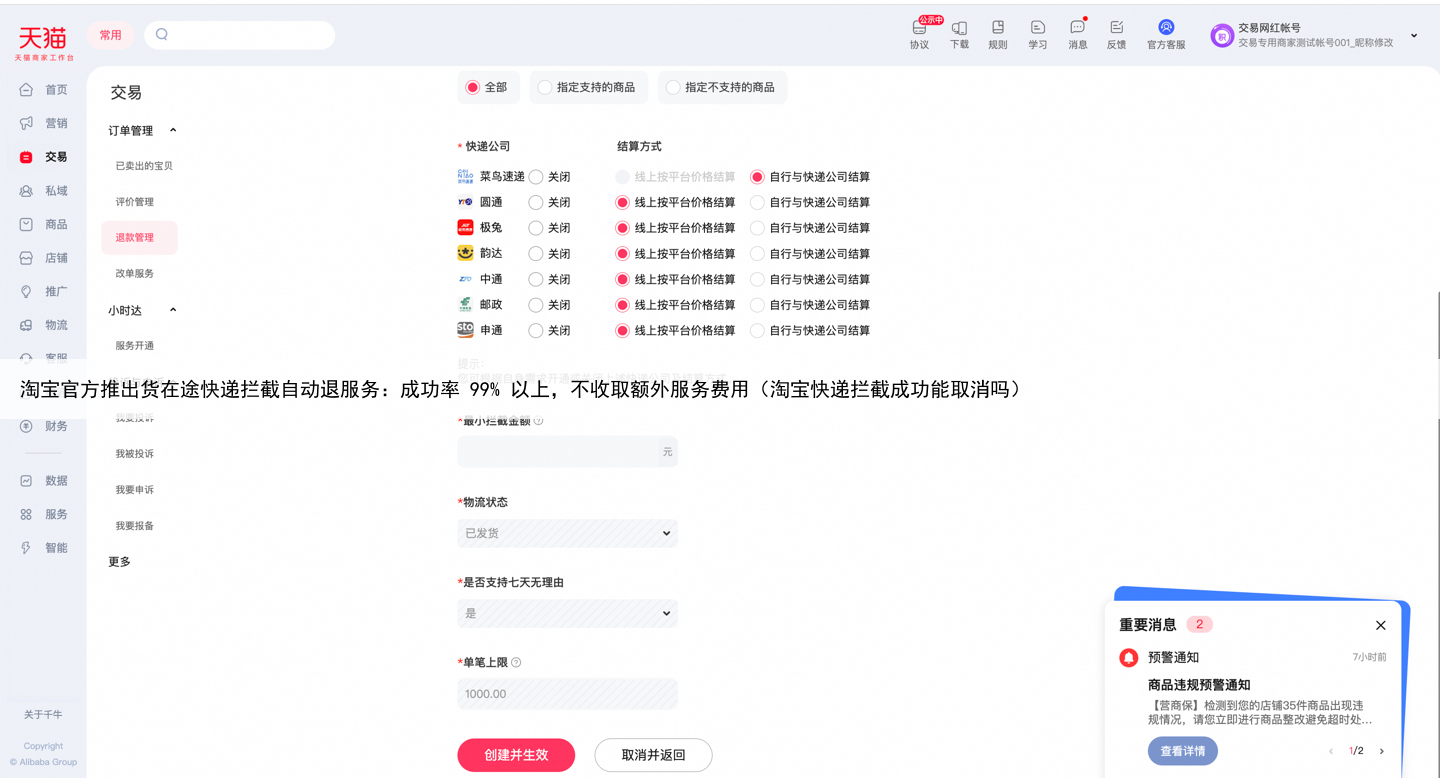 该笔售后单的订单只有一笔子订单且只有一个包裹实际支付金额 1000 元以内(对于每个运单,快递赔付最多支持 1000 元)支持 7 天无理由的商品非跨境商品非菜鸟仓商品淘宝官方表示,该服务不仅减轻了售后客服确认物流拦截进度需要的人力成本,还提升了商家售后处理的效率,大幅缩短了退款处理时长。