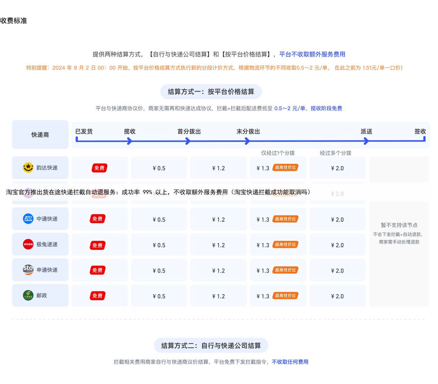 据称,由平台向快递公司下发拦截指令,拦截成功率高达 99% 以上,且平台不收取额外服务费用当然,如果存在拦截费用需商家自行与快递公司进行结算,或者按照 0.5~2 元 / 单的平台费用进行线上结算(无需和快递公司达成拦截协议,发货费用单独结算)。