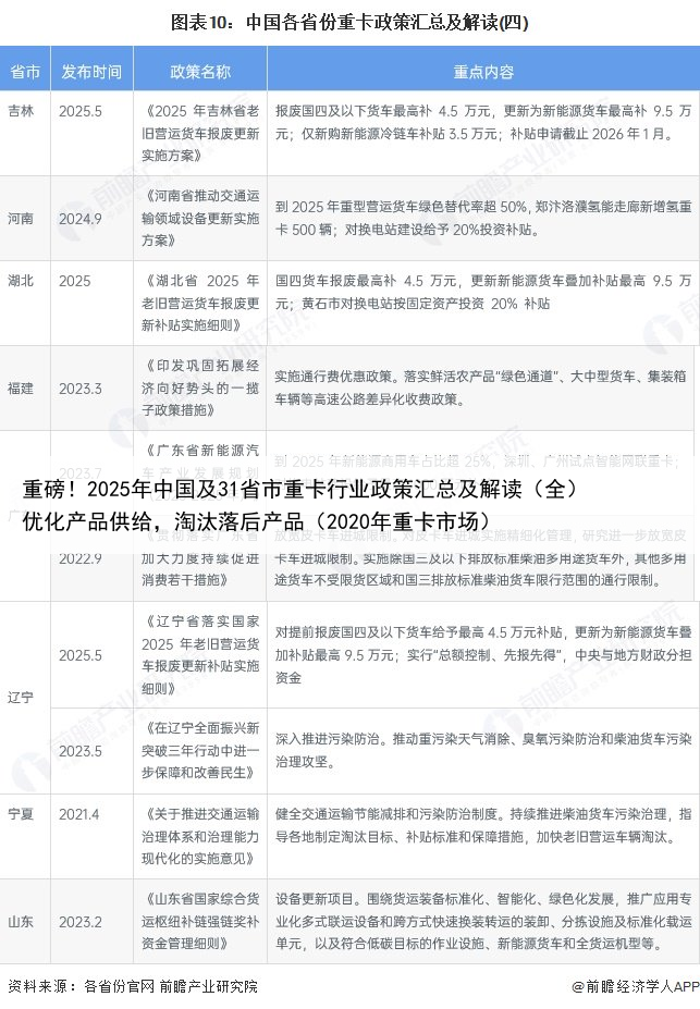 更多本行业研究分析详见前瞻产业研究院《中国重卡(重型卡车)行业发展前景预测与投资战略规划分析报告》同时前瞻产业研究院还提供产业新赛道研究、投资可行性研究、产业规划、园区规划、产业招商、产业图谱、产业大数据、智慧招商系统、行业地位证明、IPO咨询/募投可研、专精特新小巨人申报、十五五规划等解决方案。