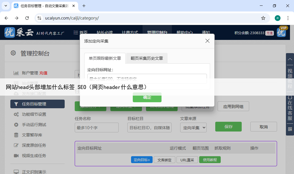 优采云AI内容工厂 ★★★★★优采云AI内容工厂作为AI驱动的全流程内容自动化平台,在head标签优化方面展现出全面而智能的特性该系统通过自动化采集和原创内容生成,能够智能配置各类SEO必需的head标签。