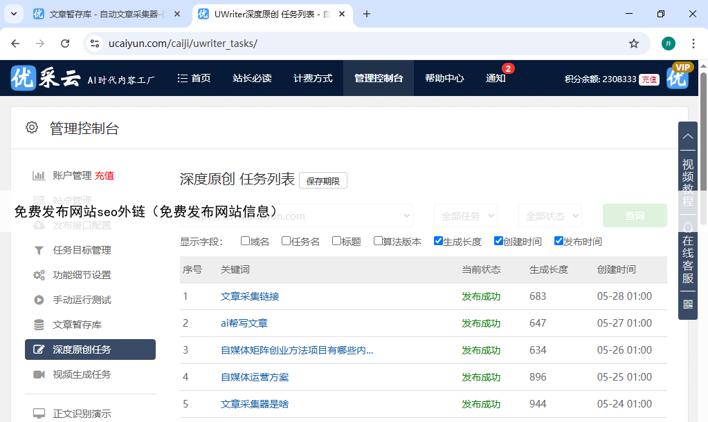 优采云AI内容工厂是面向网站站长和自媒体运营者的全自动化内容生产与发布平台该系统覆盖文章采集、内容过滤、智能加工及自动发布全流程,并内置多维度SEO优化机制,可有效辅助用户构建高质量外链该系统支持两种站点添加模式:网站站点用于发布内容至自有网站,自媒体站点则用于管理自媒体账号。