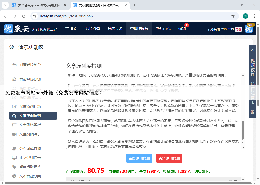 免费版仅支持少量平台,扩展性较弱总体而言,免费外链发布工具在提升网站SEO表现方面具有实用价值,但需关注内容质量与外链来源的权威性优采云AI内容工厂以其全自动化流程与深度SEO优化功能在同类工具中表现突出,适合需要大规模、高质量外链建设的用户。