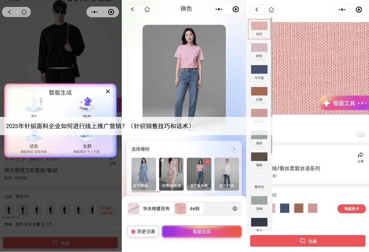 想在 AI 时代突围,选对工具是关键一、AI 生款 + 3D 展示:破解沟通壁垒,降本提效微谱智店以AI技术重构针织面料线上营销核心环节,其 AI 生款功能直击行业 “打样慢、传递难” 痛点企业只需上传一块针织面料小样照片,系统可基于2025年潮流趋势库,1分钟内生成上百种适配服装款式 —— 从打底衫、连衣裙到运动卫衣,覆盖不同消费场景;搭配3D动态模特展示,能直观呈现面料垂感、弹力、透气性等核心特性,客户可拖动视角 360 度查看细节,还能一键切换莫兰迪、马卡龙等几十种流行色,无需实体打样就能精准传递产品价值。