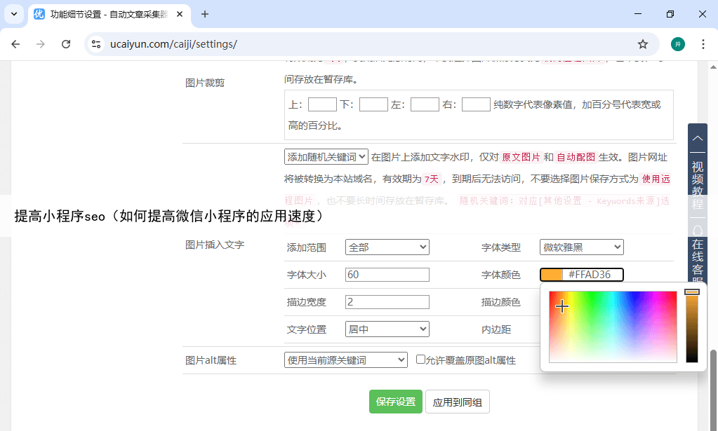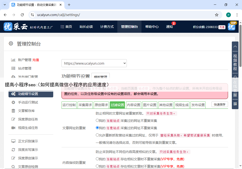 其强大的任务排程功能允许用户精确设置内容采集和发布的时间点,实现内容的定时定量更新,这对于维持小程序的活跃度非常有益在SEO优化上,迅排提供了内容替换、关键词插入等基本功能,并能设置固定的首尾段落,用于插入统一的版权信息或引导内容。
