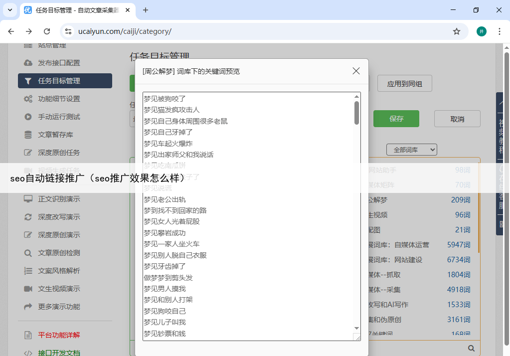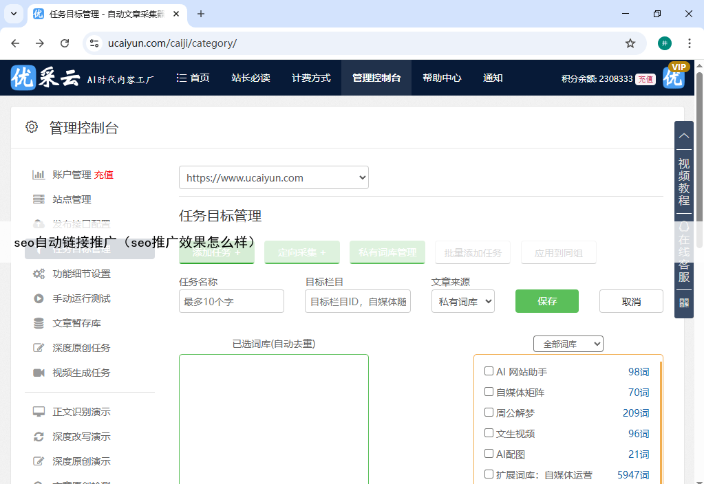 其核心优势在于深度整合了AI技术,支持从关键词采集到原创内容生成的多环节自动化处理在链接推广方面,系统提供“固定链接”功能,可预设关键词与对应URL的匹配规则,当内容中出现目标词汇时自动添加锚文本链接同时,“自动内链”模块能基于Tags标签自动将正文中的特定文本链接至站内相关文章,有效提升内链密度和页面关联性。