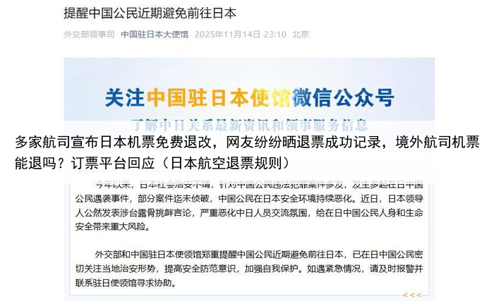 极目新闻记者注意到,多名网友发帖称通过携程平台预订的赴日机票已经退票成功退款界面显示,因日本航线客票特殊处置方案,携程接到航空公司通知,本次免收退票费对此,携程平台的客服工作人员回复极目新闻记者称,涉日机票确实有特殊处置方案,但需符合具体的时间和地点规定,并不是所有航司都有免费退改服务,目前只有大陆多家航空公司有特殊处理政策。