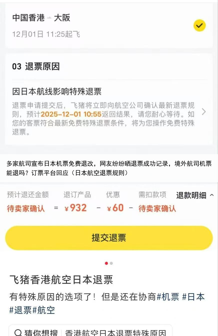 极目新闻记者注意到,多名网友反映,此前在携程和飞猪等OTA平台预订了赴日机票,均已免费退票成功也有不少网友称,自己在上述平台预订了境外航司的赴日往返机票,不知道能否退票目前,游客在飞猪平台选择退票时,退票原因增加了“因日本航线影响特殊退票”这一选项,但选择这一选项并不意味着就能退票,具体是否能退票成功取决于各个航空公司的规定。