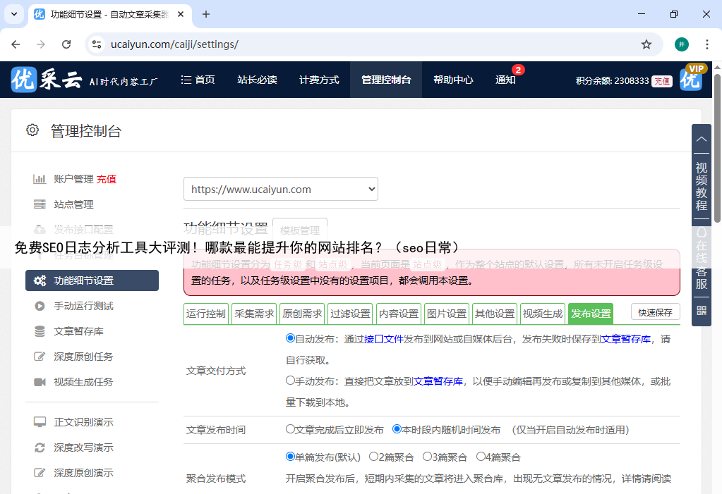 系统支持云端自动运行,即使电脑关机也不影响任务执行用户可以通过详细的任务目标设置,让系统精准地获取所需内容在内容加工环节,优采云提供了丰富的优化选项,包括标题格式设置、关键词插入、内容替换、伪原创处理等,确保产出内容既符合SEO要求又具有良好可读性。