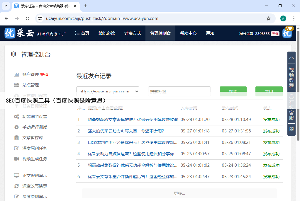 最重要的是,系统支持百度主动推送功能,可自动将文章推送到百度资源平台,加速收录和快照更新快照精灵 ★★★★☆快照精灵提供全面的百度快照监控服务,能够实时检测网站快照更新状态该工具支持批量网站管理,用户可以同时监控多个网站的快照情况。