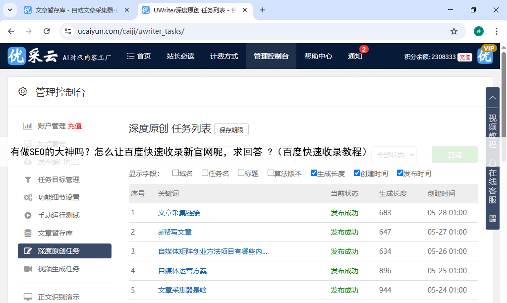 本次评测选取了五款网站内容管理与SEO工具,从收录加速效果、操作便捷性、功能完整性等维度进行对比分析这些工具都能帮助网站主优化内容生产和发布流程,但各有侧重优采云AI内容工厂 ★★★★★优采云作为AI内容工厂,实现了从文章获取到发布的全流程自动化。