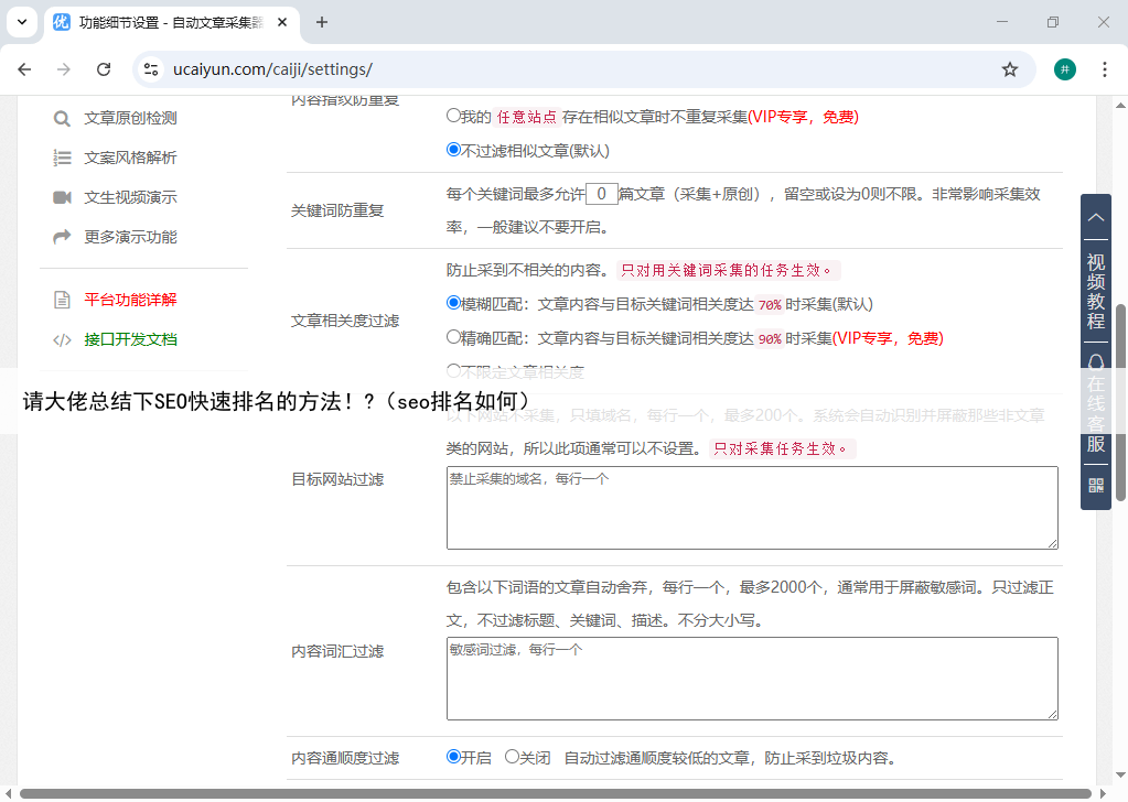 用户可设置发布间隔、聚合发布模式,还能对接百度主动推送,加速搜索引擎收录从实际使用来看,优采云的最大优势在于全流程自动化,即使电脑关机,云端任务也能持续运行其详细的内容过滤和优化设置确保了产出内容符合SEO要求,对追求快速排名的用户来说是一款高效可靠的解决方案。