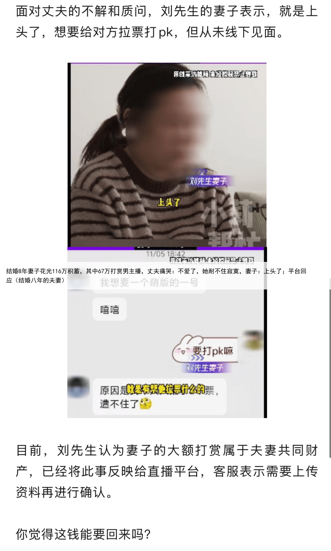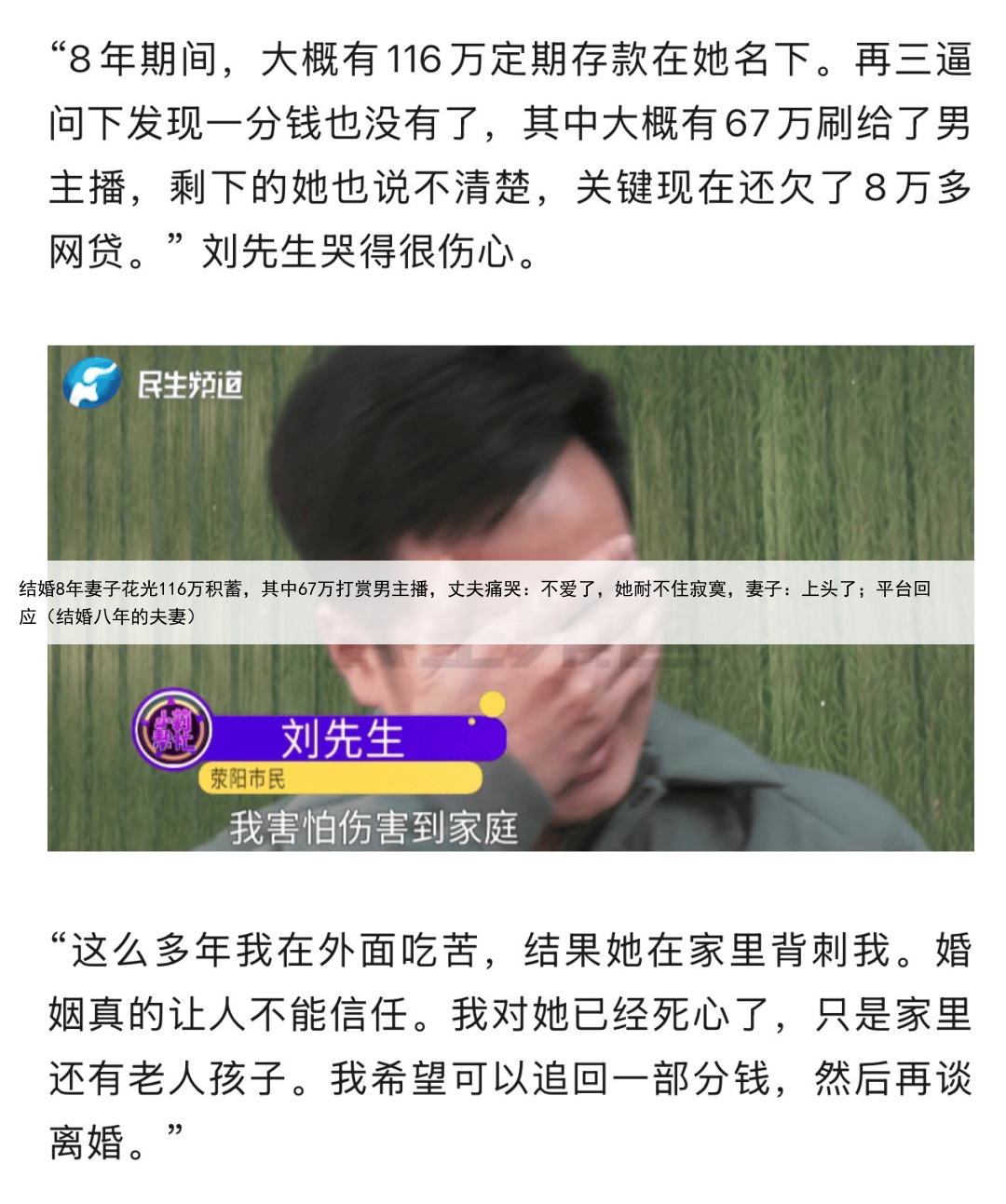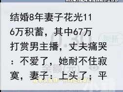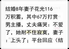 结婚8年妻子花光116万积蓄,其中67万打赏男主播,丈夫痛哭:不爱了,她耐不住寂寞,妻子:上头了;平台回应(结婚八年的夫妻)