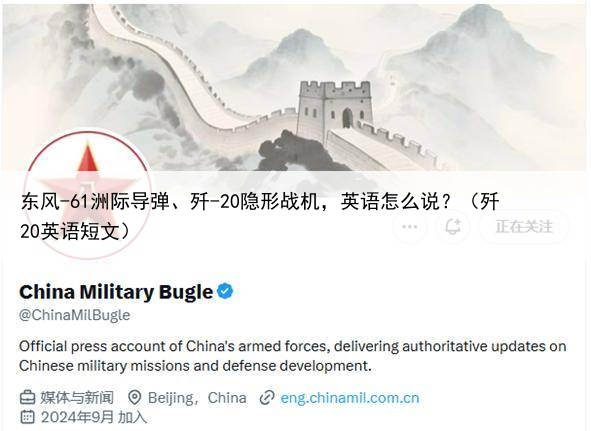账号里常出现的“明星装备”像歼-20隐形战机、055型驱逐舰、火箭军等都配有专业的英文表达看资讯、学英语,一举两得Each post comes with concise English deions of key military equipment, turning every update into a fun and informative micro-lesson in both defense knowledge and language.