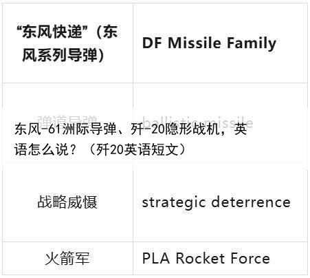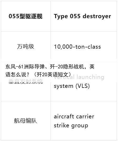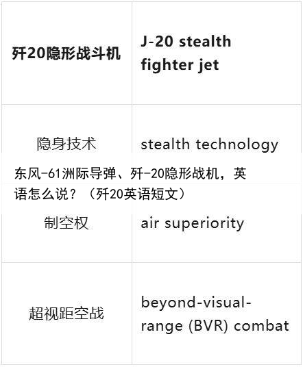 东风-61洲际导弹、歼-20隐形战机,英语怎么说?(歼20英语短文)
