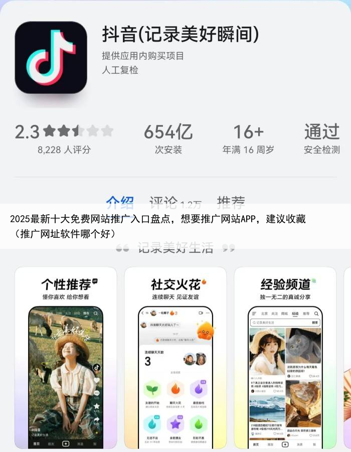 十大免费网站推广入口三:抖音抖音作为现下最热门的一个社交平台,拥有庞大的用户流量池,且多为活跃用户通过抖音,大家可以发布一些APP相关的视频,利用抖音的流量,给自己的APP增加曝光,吸引他们下载注册当然,前提得要遵守抖音的发布规则,否则容易被封号。