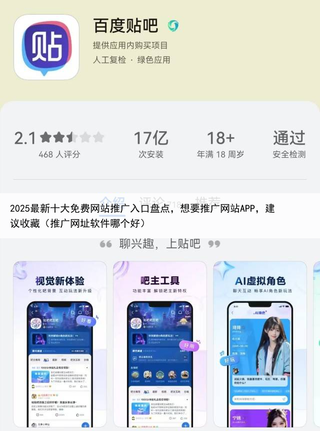 十大免费网站推广入口五:百度贴吧百度贴吧作为最早存在的社区平台,它也为推广网站APP提供了一个渠道因为百度贴吧背后有百度支撑,本身就有不少流量,可以在百度贴吧内搜索相关的吧,在里面发布推广贴,提高自己APP的曝光度。