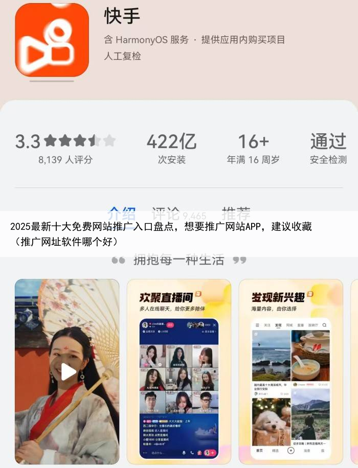 十大免费网站推广入口六:快手快手作为一个同样拥有不小流量的社交平台,也是一个非常不错的网站APP推广途径可以在快手上发布一些APP相关的视频,吸引用户前来安装不过,在发布视频的时候也要注意遵守平台发布规则,避免违规。