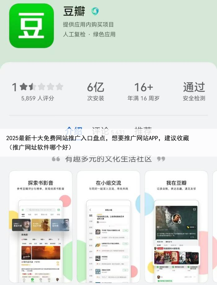 十大免费网站推广入口十:豆瓣豆瓣大部分小组成员都是活跃用户,通过加入一些APP相关的豆瓣小组,在组里发布APP种草的帖子,可以吸引不少精准用户但有一点要注意,每个小组都有对应的组规,一定要在遵守组规的前提下发布帖子,避免违规被踢。