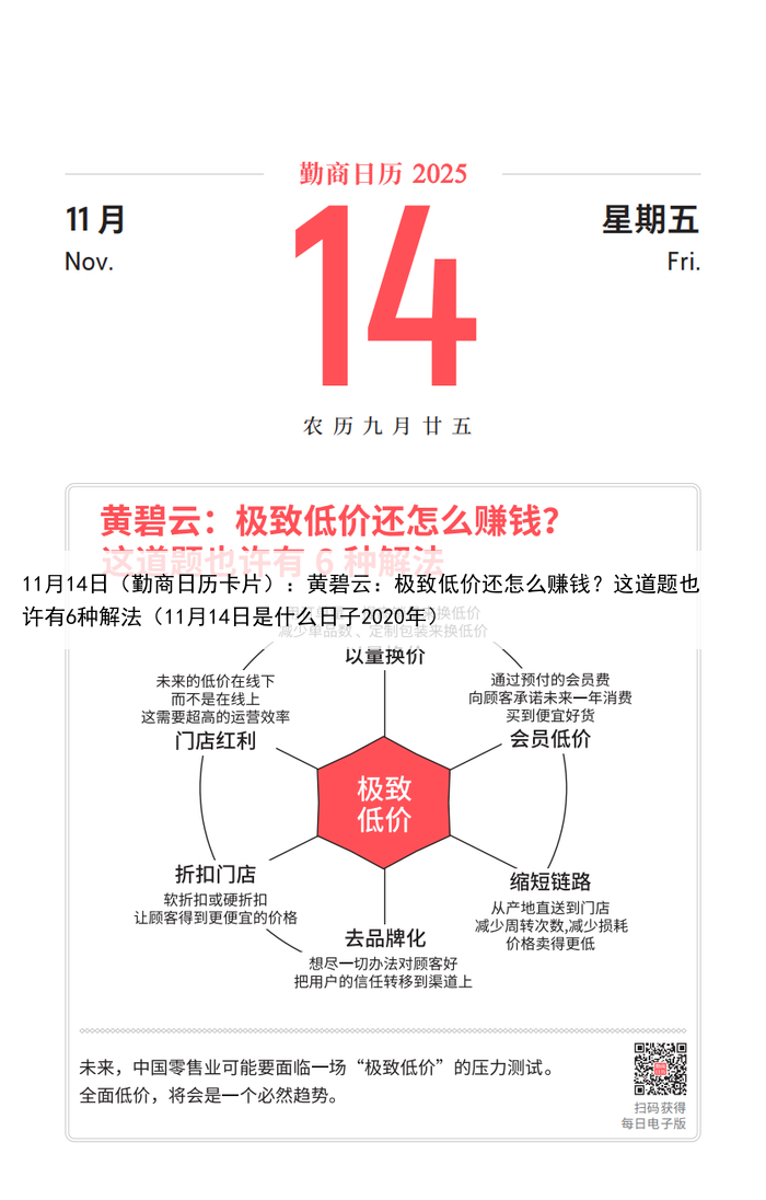 11月14日(勤商日历卡片):黄碧云:极致低价还怎么赚钱?这道题也许有6种解法(11月14日是什么日子2020年)