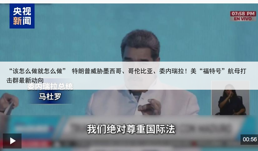 图片来源:央视新闻当天早些时候,美国总统特朗普表示,“在某个时候”,他会和马杜罗谈谈但同时,特朗普没有排除美军在委内瑞拉进行陆上行动的可能,“我不排除任何可能性,我们必须妥善处理委内瑞拉相关事宜”马杜罗则表示,屠杀和轰炸委内瑞拉人民的做法不可接受。