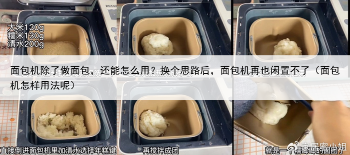 具体做法很简单: 大米130g、糯米130g、清水200g,直接倒入面包机里面,选择年糕键,会加热做成米饭,搅拌成团,搅拌结束厚,就变成面团了。
