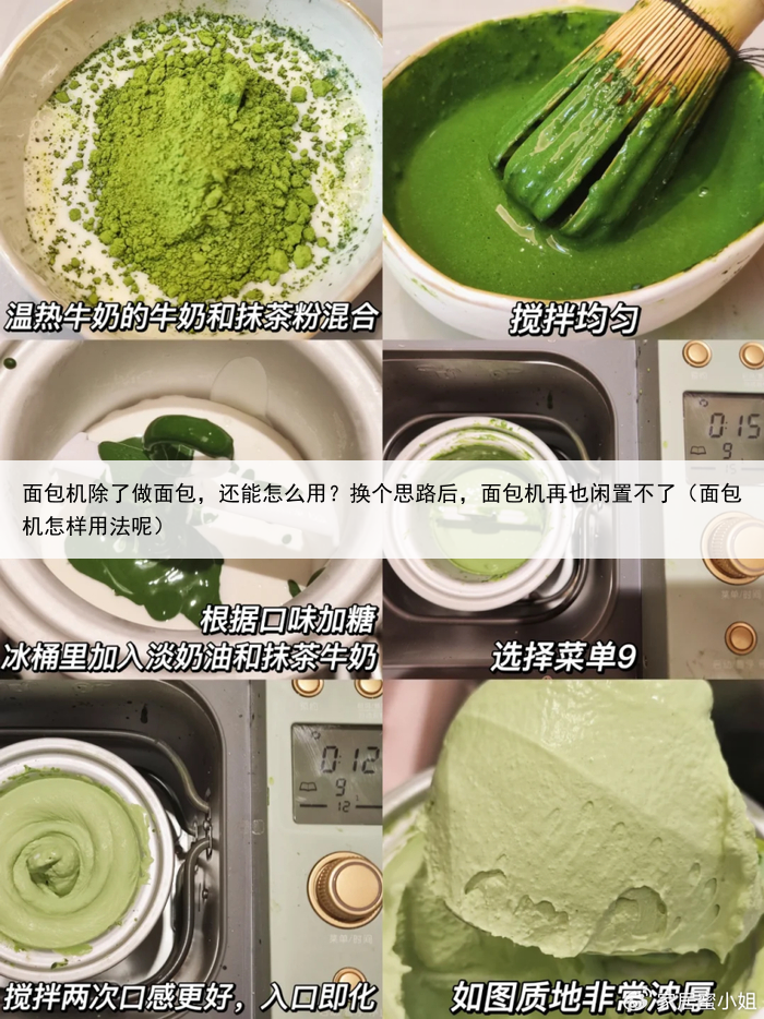 准备食材:抹茶粉10g、牛奶 80g、淡奶油 200g、糖 18g 制作方式很简单:温热牛奶+抹茶粉搅拌均匀,和淡奶油一起放入面包机的冰桶里面,选择冰淇淋模式,搅拌两次后,吃起来口感会更加细腻