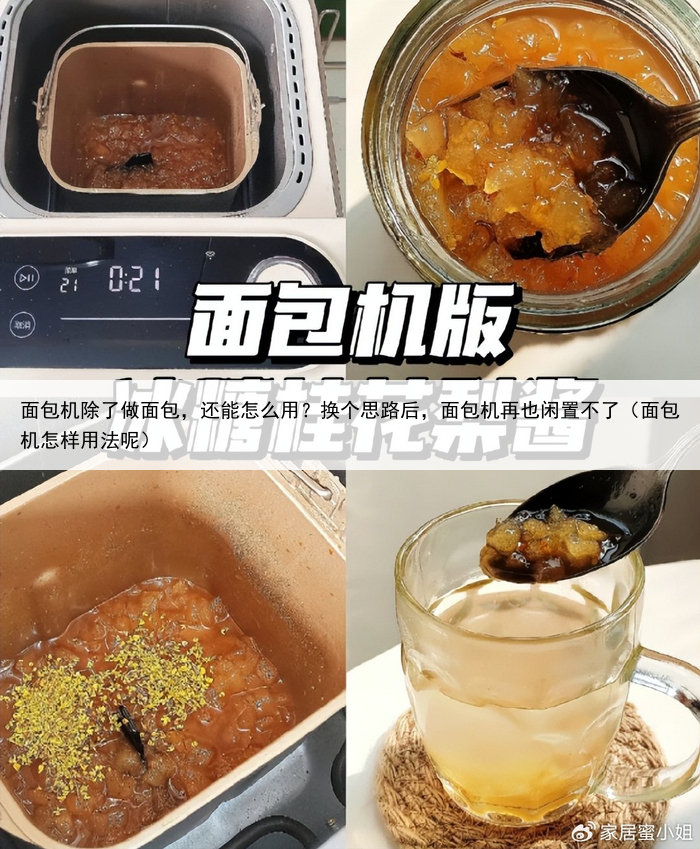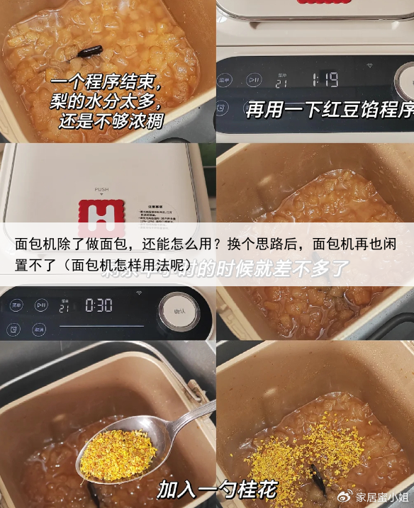 冷冻之后,吃起来口感更加细腻,比外面卖的冰淇淋更好吃,大家一定要试试!06、冰糖桂花梨酱 秋冬季节后,买了很多梨子。 正好家里有闲置的面包机,想着用面包机做一些冰糖桂花梨酱。