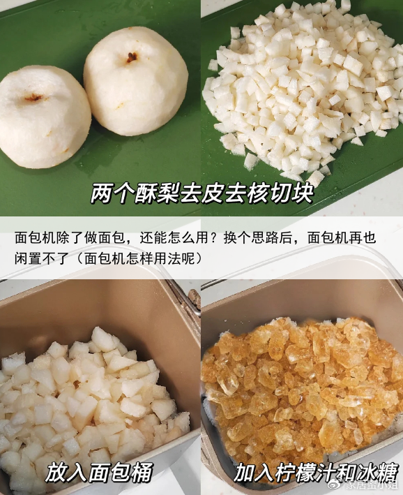 做法非常简单: 先把梨子洗干净后去皮,再把梨子切成块。 把梨子块放入面包桶里面,加入柠檬汁、冰糖。