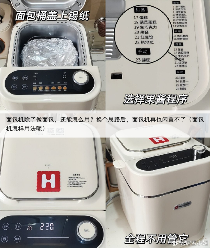 食材放入面包桶里面之后,最好在上面盖上一层锡纸。 这样就不用担心食材溅出来了,选择果酱模式,整个过程中不需要管它了。