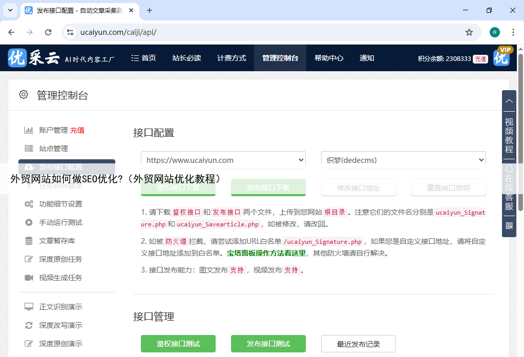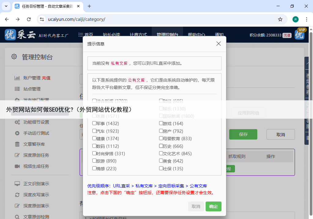 3. 自动化与效率:“云端自动运行”确保任务在服务器上持续执行,不受本地设备限制配合“自动发布”交付方式,可以实现从内容生产到上线全流程无人化操作,极大提升了内容更新的频率和效率4. 内容质量控制:系统内置了“内容指纹防重复”、“文章相关度过滤”、“内容通顺度过滤”等多重质检机制,确保采集和生成的内容质量符合基本标准。