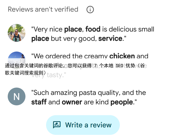 3. 回顾片段谷歌会在商家资料的三个评论摘要中,以粗体显示频繁出现的关键词。这能吸引搜索这些关键词的用户访问您的商家资料,从而有望提高点击率。