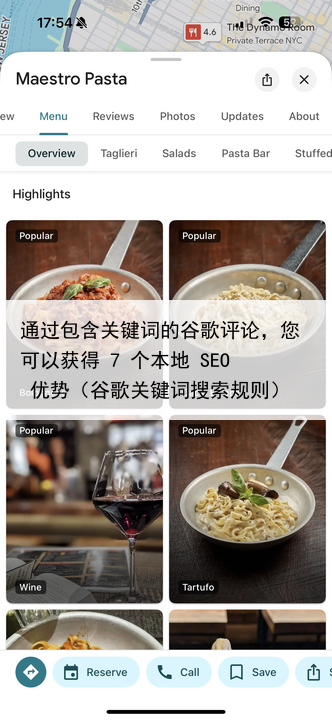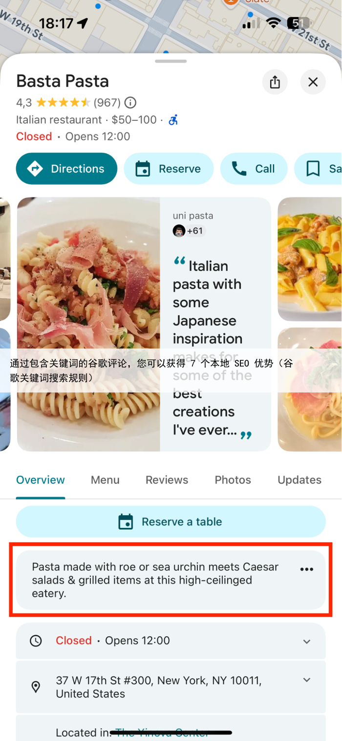 克劳迪娅·托米娜的最新分析表明:菜单高亮部分会影响排名评论中的关键词会影响“菜单亮点”部分因此,当你的评论中提到的某个术语出现在菜单高亮显示时,你在该术语上的排名应该会更好5. 人工智能编辑摘要谷歌的人工智能生成的商家简介会从评论中提取概念(例如“舒适”)来描述您的商家。
