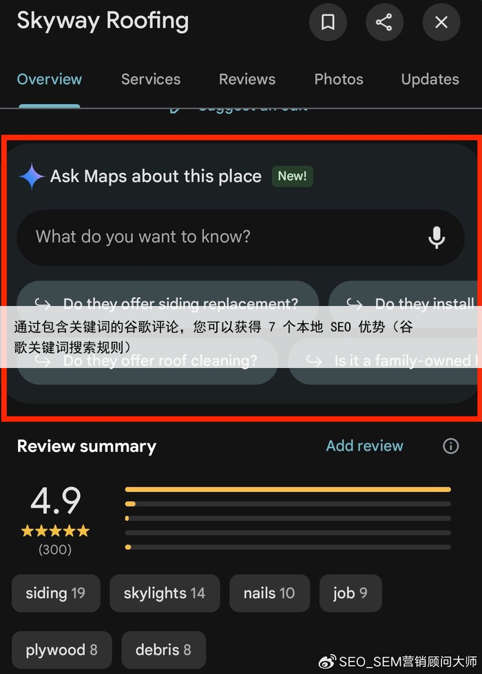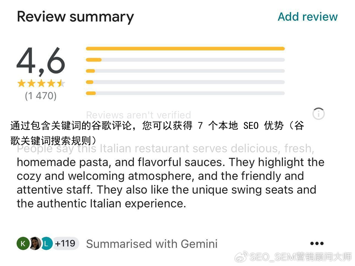 虽然谷歌的 AI 摘要无法编辑,但鼓励客户在评论中包含特定关键词可能会影响 AI,使其更加强调对你的业务最有利的方面。