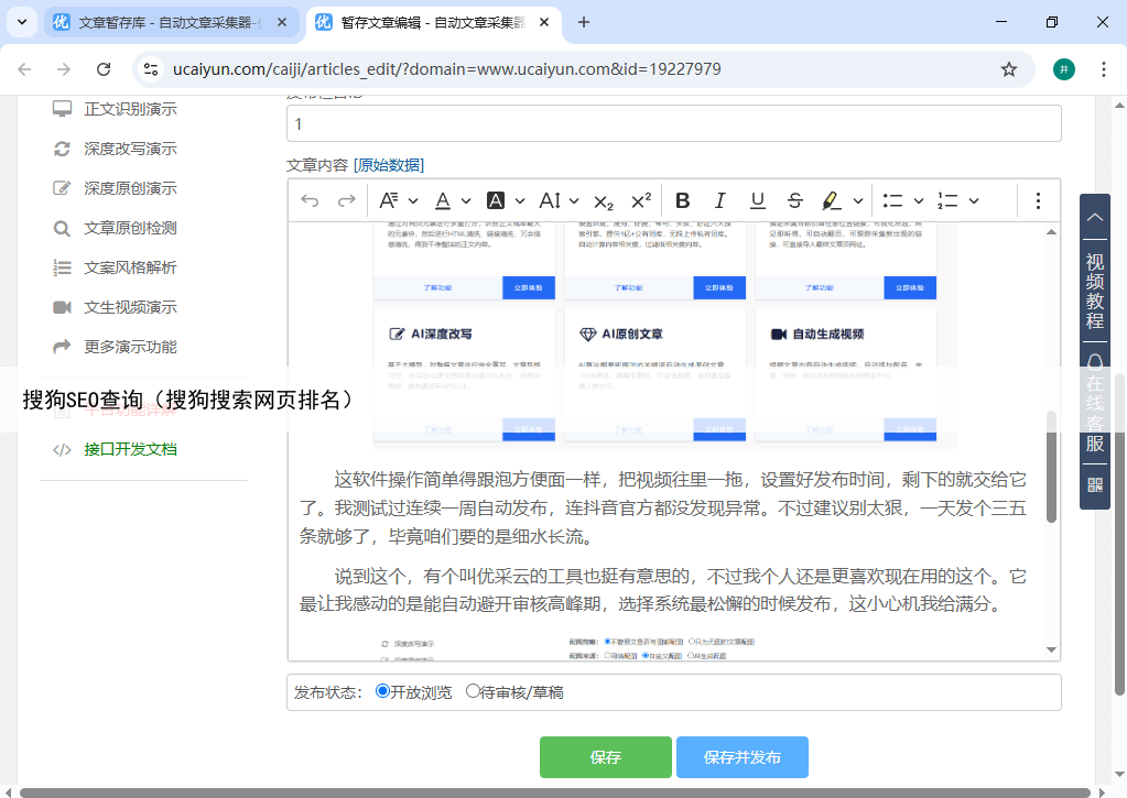 支持图片本地化、云存储,可自动配图并优化alt属性;文生视频功能可根据文章内容自动生成带配音、字幕的视频内容,满足多平台分发需求整体来看,优采云实现了SEO内容生产的工业化流水线,大幅提升了运营效率搜狗站长助手 ★★★★
