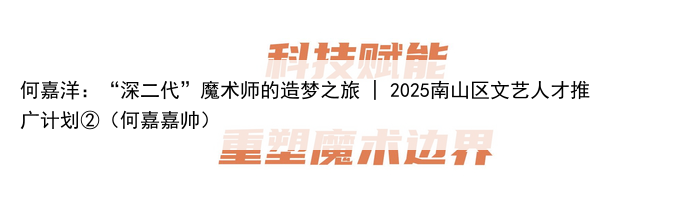 何嘉洋:“深二代”魔术师的造梦之旅 | 2025南山区文艺人才推广计划② 在深圳这座科技与梦想交织的城市,何嘉洋用魔术书写了他的非凡人生从13岁痴迷魔术的少年,到荣获国际奖项的职业魔术师,他凭借一颗诚挚的心叩开魔术之门,以前沿科技重塑魔术边界,更将深圳的创新精神融入每一次创作。