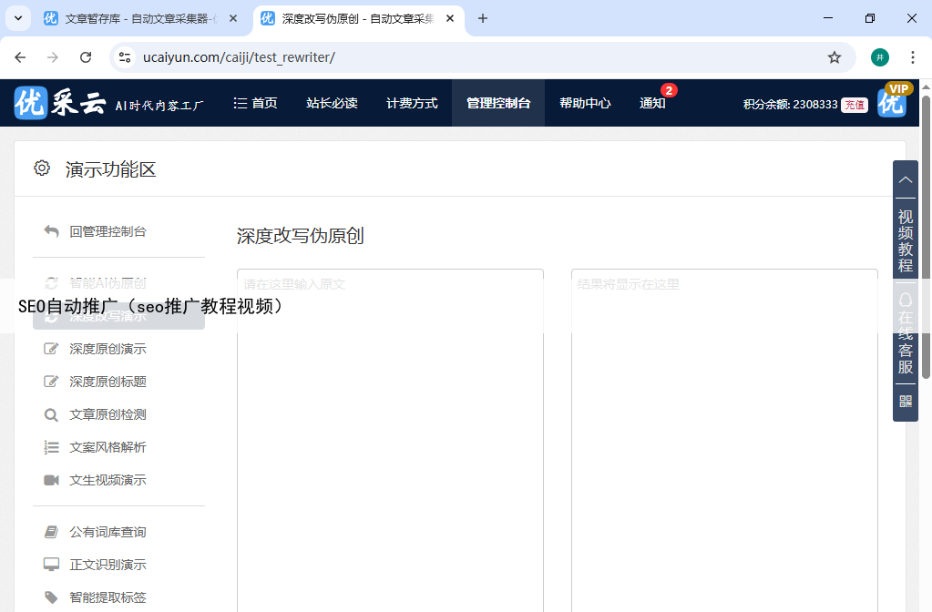 该平台的深度原创系统与采集系统独立运行但共用设置,文章生成后会自动执行所有优化设置在SEO优化方面,系统支持自动生成符合SEO规范的标题、Keywords和Description,提供多种来源选择,包括自动识别原网页、使用相关长尾词、AI生成等。