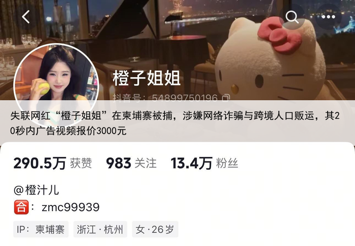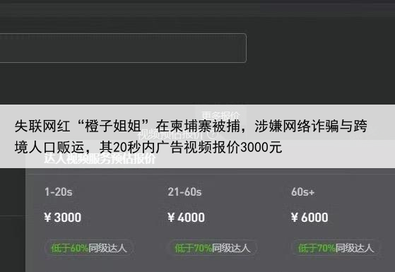 失联网红“橙子姐姐”在柬埔寨被捕,涉嫌网络诈骗与跨境人口贩运,其20秒内广告视频报价3000元