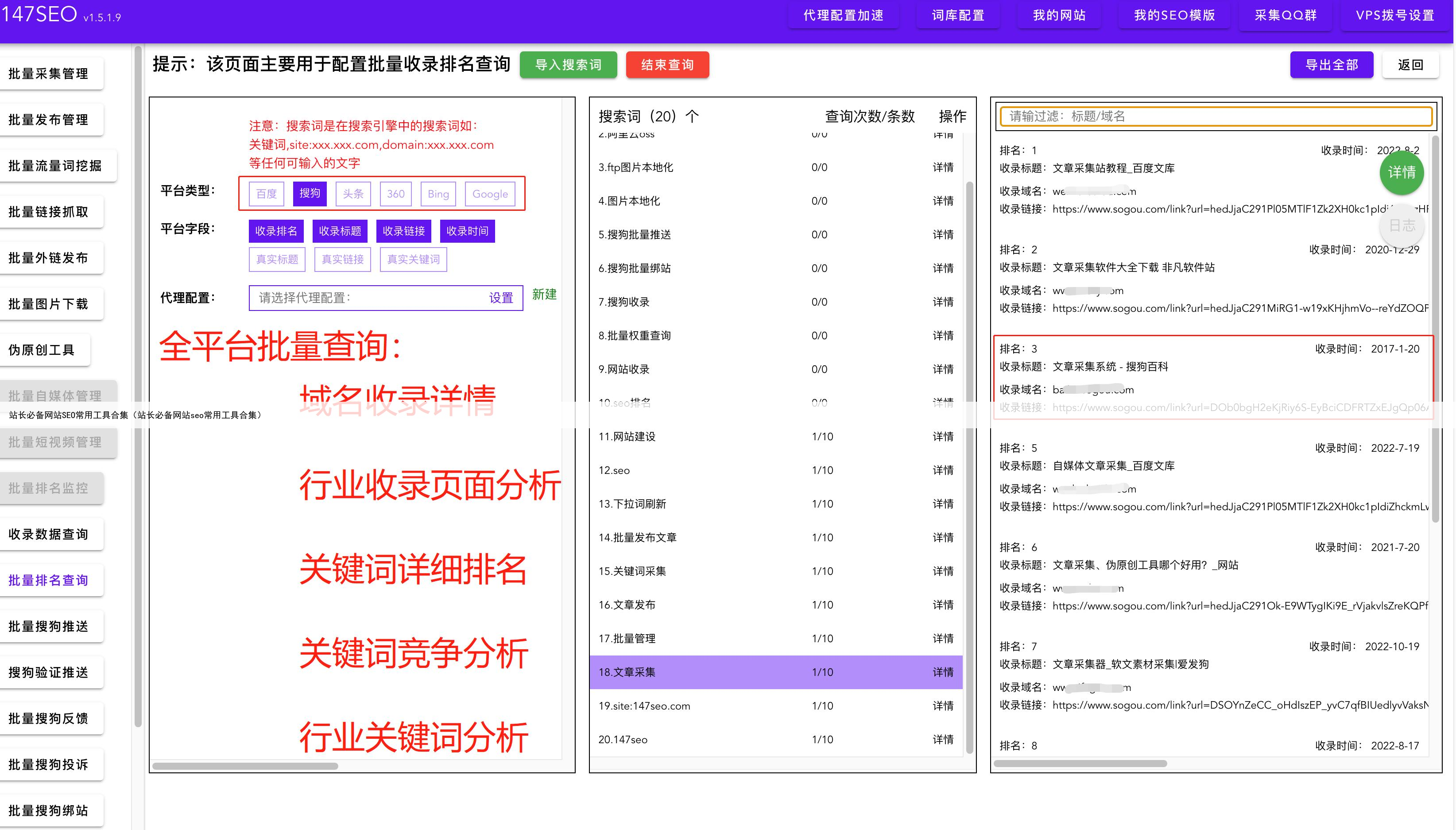 我们也可以使用SEO工具对上述信息进行批量查询,通过批量查询排名情况,收录详情,以及历史数据进行多域名批量查询,